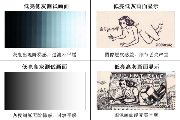 傳統(tǒng)的液晶顯示亮度在300至500nit左右,由于LED顯示屏的光源是LED自發(fā)光器件,人眼對(duì)其敏感度更高,為了讓人在近距離長時(shí)間觀看下,人眼不會(huì)產(chǎn)生疲勞而很舒服的感覺,就需要小間距顯示屏的亮度比液晶屏的亮度更低,大概在100至300nit左右,在如此低的亮度下,一般顯示屏的灰度會(huì)從高亮下的16BIT下降到8BIT或者更低,其效果對(duì)比如下表格:
