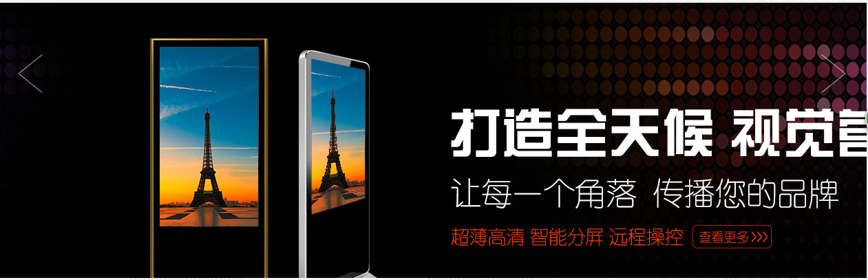 從液晶廣告機到網絡廣告機;從室內廣告機到戶外廣告機;從純播放式廣告機到互動式廣告機。廣告機的發(fā)展一直平步青云,中國廣告機行業(yè)的發(fā)展也越來越精細化,精品化。一家企業(yè)可能專精于飛機場廣告機,或者地鐵站廣告機,或者公交站牌廣告機的制作。然而。九個孩子一個媽,可別忘了,我們都是屬于廣告機大家族的哦!而廣告機系列,則是廣告機的根本發(fā)源。不過,受源技術非國有的限制,廣告機行業(yè)原料技術上的發(fā)展以及質量上的發(fā)展進入了瓶頸階段。大部分廣告機廠家選擇暫時放下廣告機的源技術開發(fā),轉而走向內容設計,這點小編以后會詳細談到。不過小編還是很期望我國能有自己優(yōu)秀的原材料技術的,那對于廣告機行業(yè)的感覺,定是不亞于第一顆原子彈的自豪感吧。